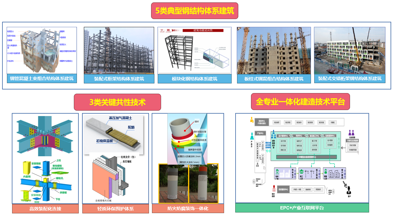 (1)鋼結(jié)構(gòu)建筑產(chǎn)業(yè)化關(guān)鍵技術(shù):研發(fā)了剪力墻、框架、模塊化、板柱結(jié)構(gòu)和交錯(cuò)桁架等5類典型鋼結(jié)構(gòu)體系建筑產(chǎn)業(yè)化集成技術(shù),重點(diǎn)突破了鋼結(jié)構(gòu)建筑產(chǎn)業(yè)化需重點(diǎn)突破的高效裝配化連接、輕質(zhì)環(huán)保圍護(hù)體系、防火防腐裝飾一體化3類關(guān)鍵共性技術(shù),開發(fā)了全過(guò)程、全專業(yè)協(xié)同一體化智能建造技術(shù)平臺(tái)。